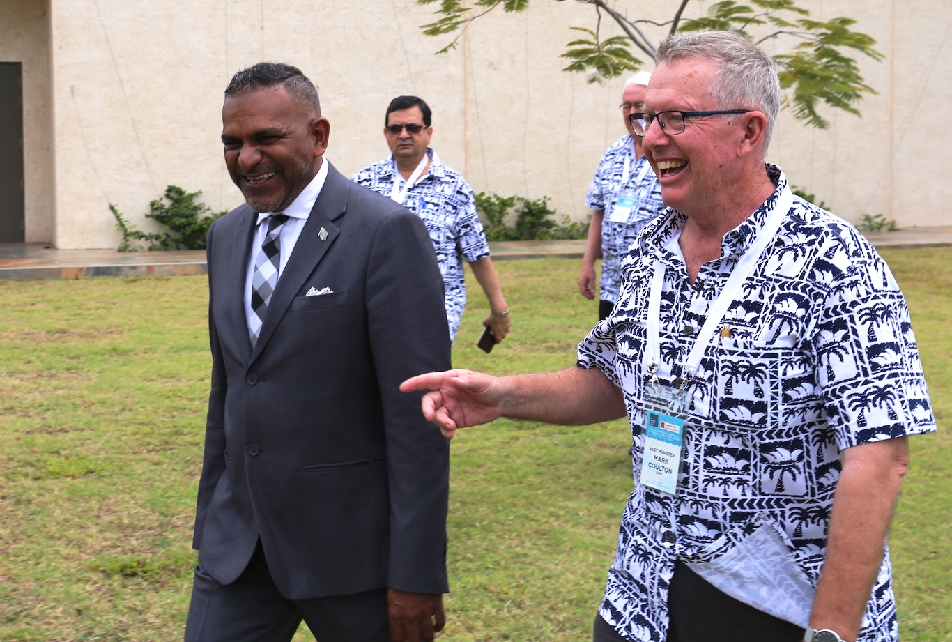 Hon. Faiyaz Siddiq Koya shares a light moment with Hon Mark Coulton MP as they make their way to the opening of the 2018 Fiji-Australia Business Forum in Momi Bay. Photo credit: Mark Tamsitt, DFAT.