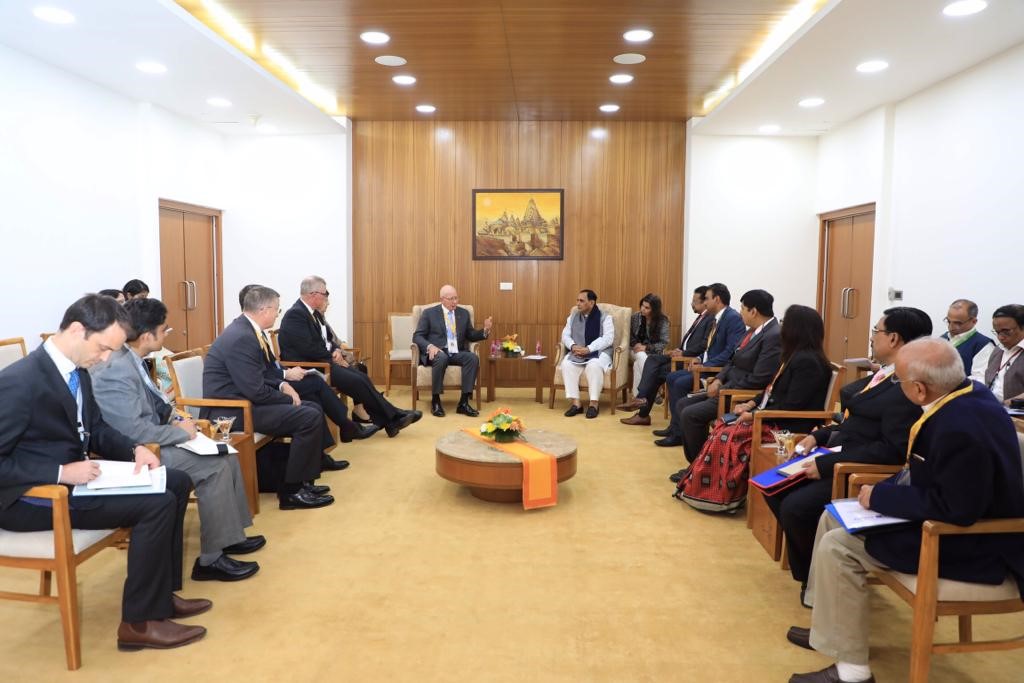 Meeting with The Hon Vijay Rupani, Chief Minister of Gujarat at Mahatma Mandir in Gandhinagar on 17 January 2019. Participants (from left): Mr Christopher Ellinger, Deputy Consul General Mumbai, Mr Rohit Manchanda, NSW Trade and Investment Commissioner to India, Col Michael Miller, Official Secretary to the Governor of NSW, Ms Catherine Heidrich, Ministerial Advisor to the Assistant Minister, Assistant Minister Coulton, Mrs Hurley, Governor Hurley, The Hon Vijay Rupani, Chief Minister of Gujarat, Mr K Kailashnathan, Chief Principal Secretary to the Chief Minister, Mr Pankaj Kumar, Additional Chief Secretary (Revenue).