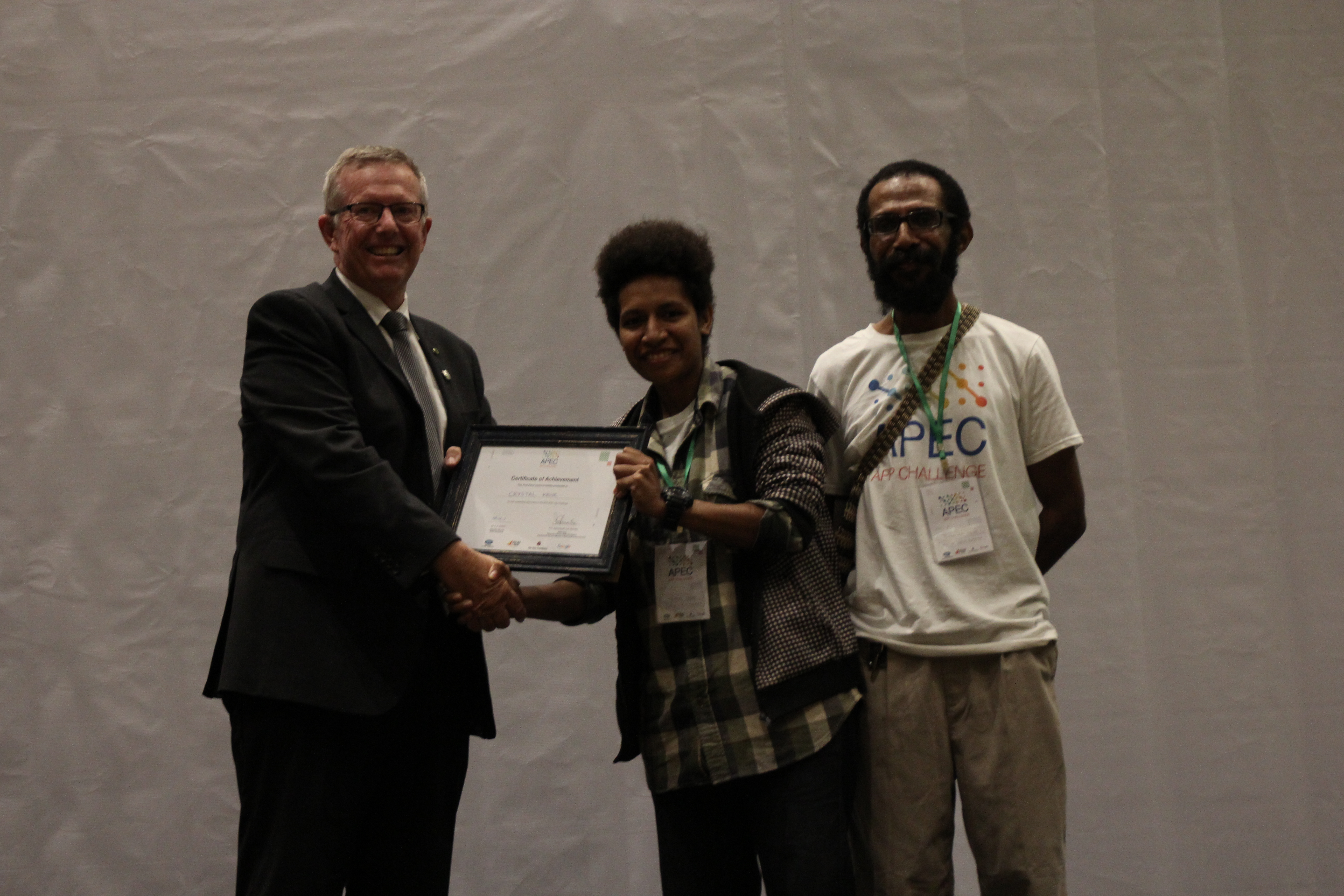 Assistant Minister for Trade, Tourism and Investment the Hon Mark Coulton MP with winners of the APEC App Challenge in Port Moresby, Crystal and Jonathan Kewe (father/daughter) from Papua New Guinea. Photo credit: DFAT/Aaron English.