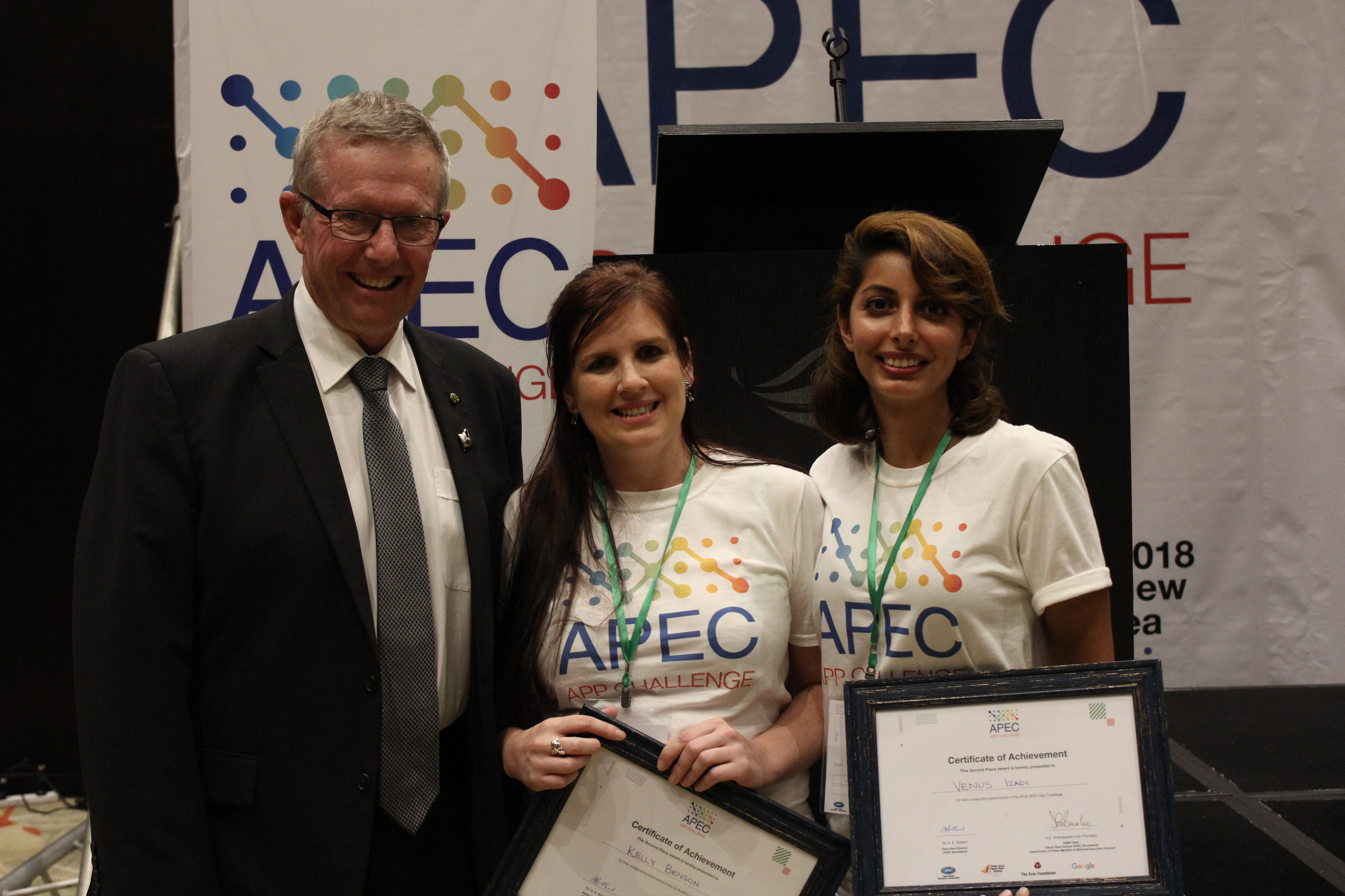 Assistant Minister for Trade Mark Coulton with runner-ups in the APEC App Challenge in Port Moresby, Australians Kelly Benson and Venus Izadi. Photo credit: DFAT/Aaron English.