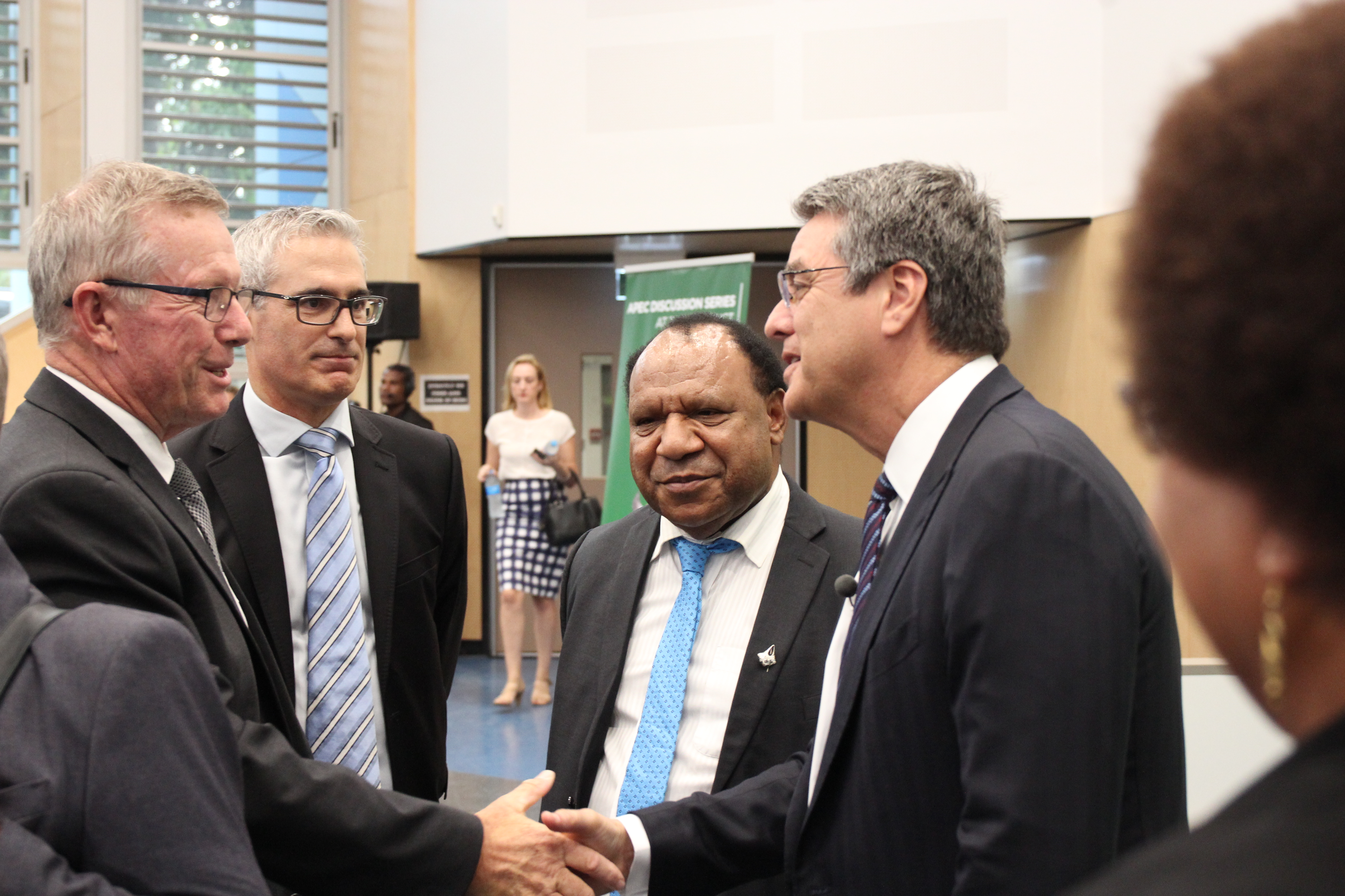Assistant Minister for Trade, Mark Coulton, with Ben David, Minister Counsellor at the Australian High Commission, PNG Minister for Foreign Affairs the Hon Rimbink Pato MP, and World Trade Organisation Director-General, Roberto Azevêdo, at the launch of the APEC Seminar Series at the University of Papua New Guinea Pacific Leadership and Governance Precinct. Photo credit: DFAT/Aaron English.